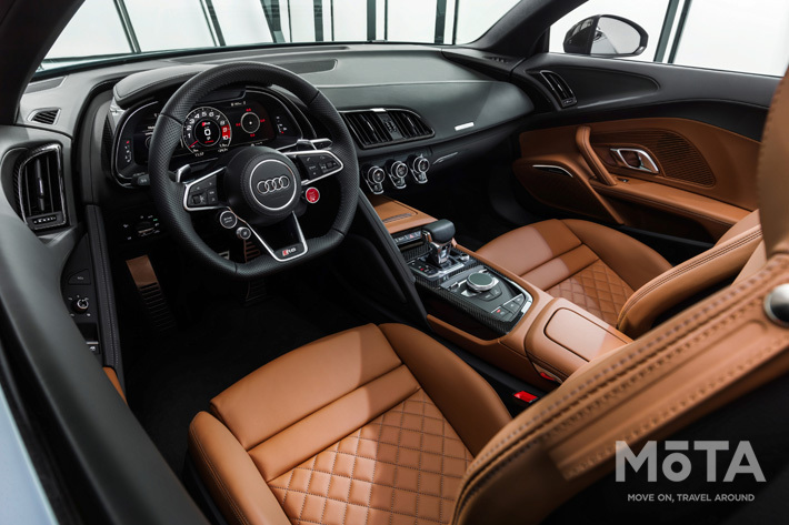 またR8スパイダーの電動式ソフトトップは遮音性に優れたクロス製で、フレームにはアルミニウムと鋳造マグネシウムを採用、トップコンパートメントカバーはCFRP製となっている。重量は約44 kgで軽量化と低重心化に貢献。開閉に要する時間は約20秒で、50km/h以下であれば走行中の操作も可能だ。