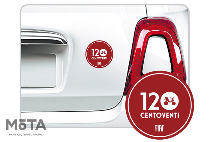 今回の限定車は、そうしたブランドのヘリテージにオマージュを捧げる限定車。車名に冠する「Centoventi(チェントヴェンティ)」は、イタリア語で「120」を指し、ブランドの120周年を祝福するモデルであることを示している。フロントフェンダーならびにリアゲートには、ブランドカラーであるボルドーを基調とし、「120 Centoventi」の文字とともに、1899年にフィアットが最初に世に送り出したモデル「FIAT 1/2 HP」を描いた専用ステッカーがあしらわれた。