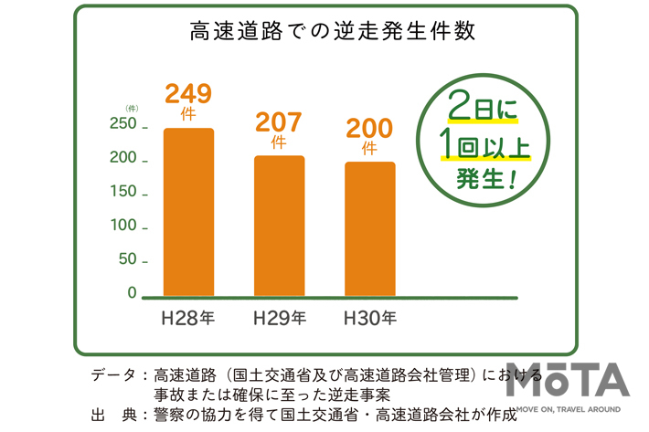NEXCO東日本は高速道路の逆走に関するデータをまとめ、平成30年に全国の高速道路で発生した逆走は200件(平成29年は207件)、発生件数は減少しているもののほぼ横ばい傾向にあることがわかった。