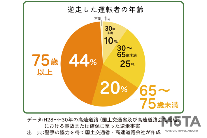 また逆走事案のうち、64%が65歳以上のドライバーによるもの(平成28~30年)となっている。
