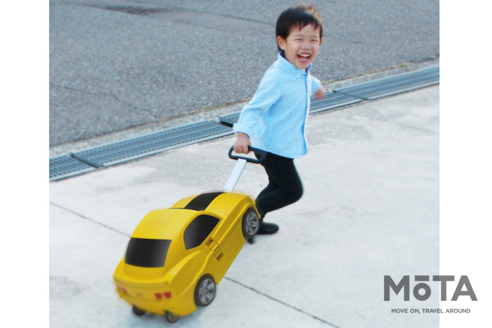 シボレー カマロ型キャリーケースは容量12L、重量約2.1kg、中の収納部分にはメッシュポケットとXバンド付きで本格的に使用できるスグレモノだ。通常のキャスターのほか、クルマの4輪のタイヤも回るため、横にして付属のロープハンドルで引けばホイールが回る様子も楽しむことができる。