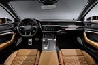 新型RS6 アバントのインテリアは、アンスラサイトカラーのアルミニウムインレイを使用して、スポーティサを強調している。インストルメントパネルは水平基調のデザインと、上下に階層化された立体的な構造によりスリムで明るい印象を与え、フルデジタルのユーザーインターフェイスは、クリアなブラックパネルデザインと調和している。