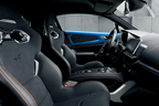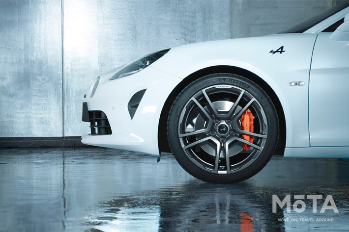 A110のリアピラーに装着されるトリコロールエンブレムは、A110Sではカーボンファイバー(黒)とオレンジに、フロントとリアの「ALPINE」のエンブレムはブラックに変更されている。またブレーキキャリパーもオレンジに塗装だ。なお黒とオレンジの対照的な色合いは、軽さと強烈なドライビングというA110Sの特性を表している。