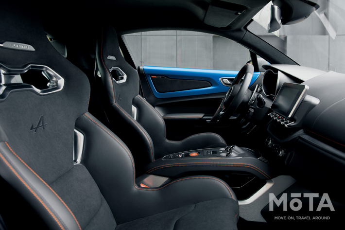 また室内のステッチカラーも、A110のブルーに対してA110Sではオレンジが採用される。洗練された黒いディナミカ(スエードタイプの人工皮革)が使用されたルーフライニング、サンバイザー、ドア内張は、この新しいモデルを特徴付ける装備のひとつである。
