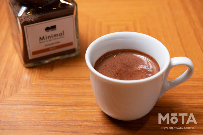 カカオ本来の豊かな風味が濃厚に味わえる温かいチョコレートドリンク。Minimalのチョコレートをそのままドリンクにしたような、カカオ感を楽しめる。