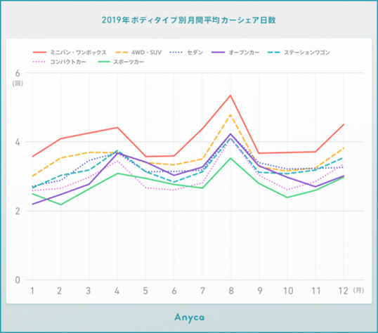 ・ボディタイプ別ランキングは、Anycaで月に1回以上シェアされたクルマについて、ボディタイプ別に2019年1月1日~2019年12月31日で1ヶ月間のシェア日数の平均値を算出。