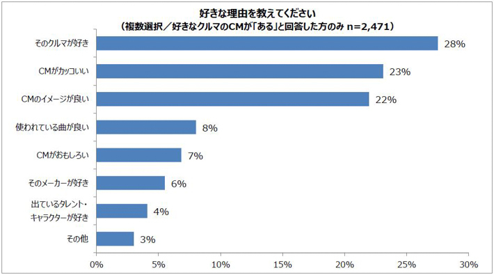 好きな理由は、「そのクルマが好き」が28%で最も多くなった。次いで、「CMがかっこいい」が23%、同様の「CMのイメージが良い」が22%で続いている。