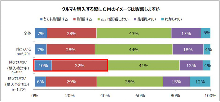 しかしクルマの所有状況別では、クルマを持っておらず購入を検討中の人は「影響する」(「とても影響する」「影響する」)が42%で全体よりも7ポイント高くなっており、CMのイメージも判断材料のひとつになることがうかがえた。