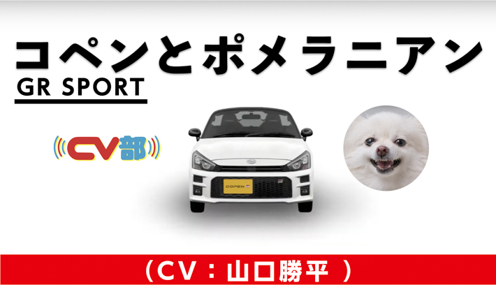 コンテンツスタジオ CHOCOLATE Inc. は2020年3月25日、身近にある「アレ」に対して、勝手に人格とキャラボイスをあてる「疑人格化プロジェクト」で345万回再生を突破したYouTubeチャンネル・CV部にて、トヨタ自動車スポンサードのもと、人気ベテラン声優の山口勝平による最新作「コペンGR SPORTとポメラニアン」を公開した。