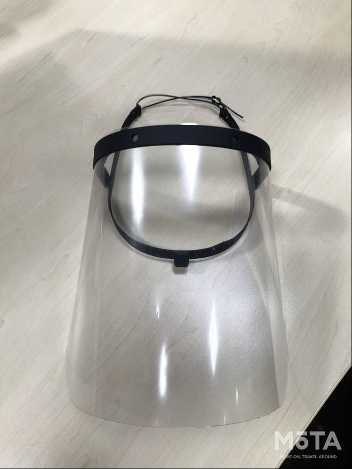 このフェイスシールドは、顔全体が透明な保護材で覆われる仕様となっている。
