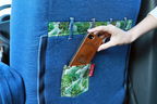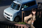 ラパンにはデニム地×モンステラ柄のシートカバーをコーディネート。室内を自分好みにアレンジすることができる。