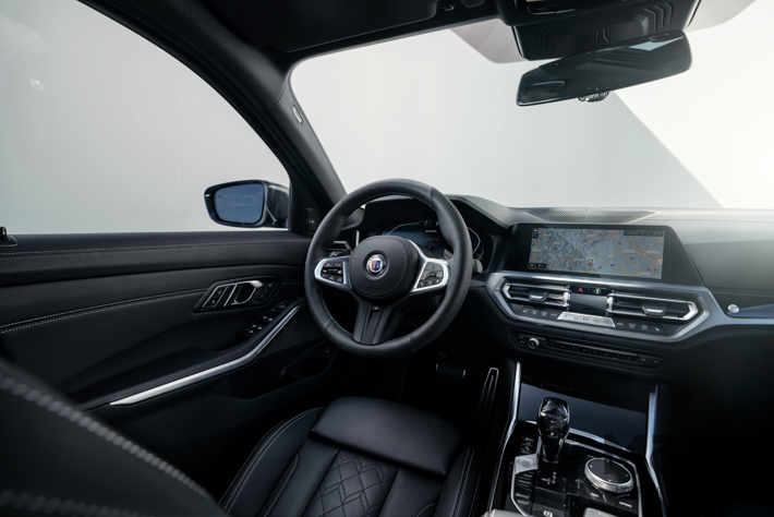 ドアシルプレートやシートバックレスト、フロアマットのメタルエンブレムなど、アルピナのクラシックなディテールがスタイリッシュな雰囲気を醸し出すと共に、ラヴァリナレザーを用い、手作業で仕上げられたアルピナ・スポーツステアリングホイールはヒーター機能を備え、快適な握り心地をもたらしている。