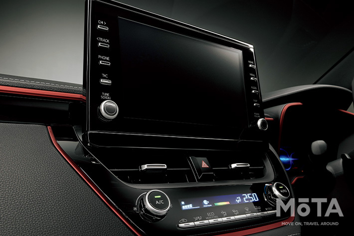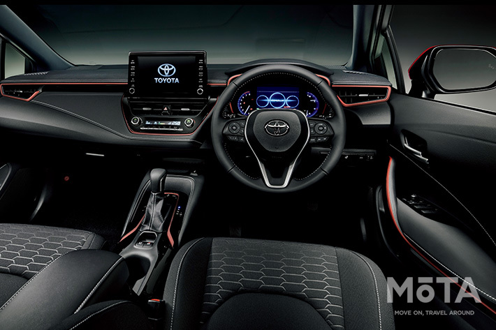 内装では、既に販売しているカローラツーリングの上級グレードに相当する装備に加え、フロントシートは、ホールド性を高めるとともに、表皮に撥水(はっすい)加工を施した上級ファブリックスポーツシートを採用。またインストルメントパネルオーナメントやセンタークラスターなどにはレッド加飾を施し、センターコンソールやドアアームレストにはグレーのステッチを効かせるなど、細部までこだわり抜いたインテリアとなっている。