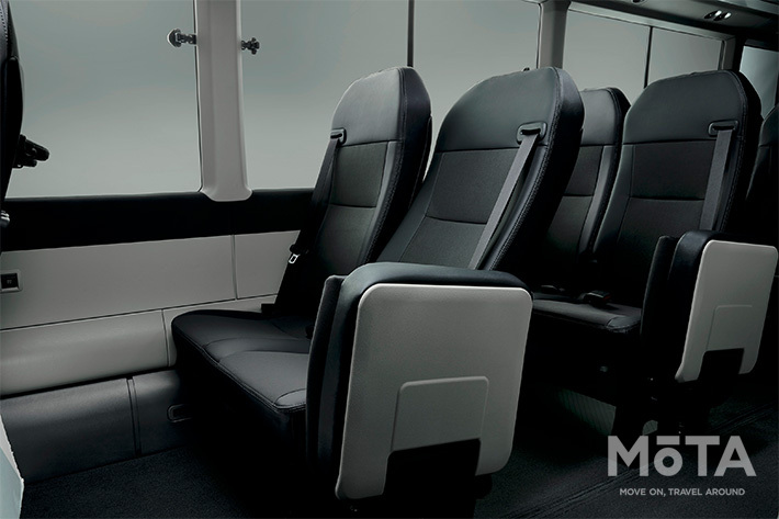 トヨタ コースター プレミアムキャビンは、ゆとりのある座席スペースを実現するため、シートは通常よりも少ない5列シートを採用。座席の前後間隔を約1m確保することで、観光やビジネスで荷物を多く持ち込まれる乗客が足元に荷物を置いてもゆったり座ることが可能。そのほか、車両後方にラゲージスペースと観音扉式バックドアを設置したことにより、ゴルフバッグやスーツケースなどを後方から効率よく出し入れすることができる。