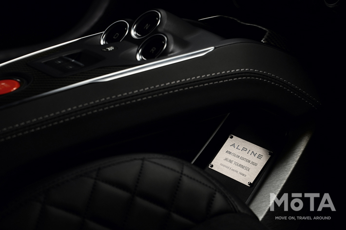 インテリアもエクステリア同様、チタンブラックの内装とドアパネルのイエロー、イエロー/カーボンエンブレム、ステアリングのイエローセンターマーカーとのコントラストが映え、このA110が特別なモデルであることを主張。