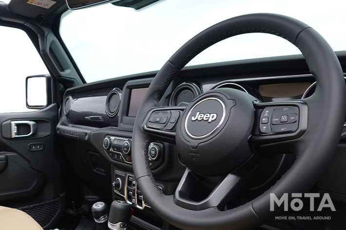 ブラックのボディカラーにタンのソフトトップというカラーコンビネーションも限定車ならではの装備で、ワイルドな佇まいに品良くマッチし、幌型ジープの味わいを引き立てる。
