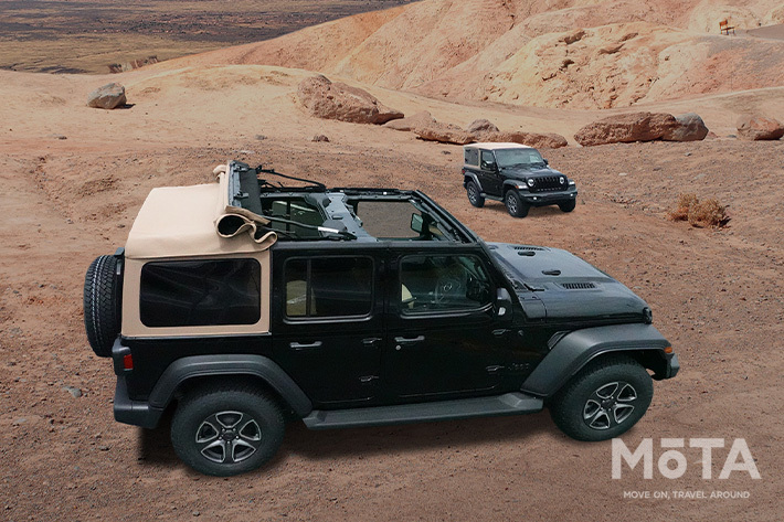 高い走破性とアイコニックなスタイルにオープンエアドライブを気軽に楽しむことができる手動開閉式ソフトトップの限定車「ラングラー ブラック&タン」を追加。現行JL型ラングラー初のソフトトップ車となるラングラー ブラック&タンは、簡単な操作で屋根を後部座席の頭上まで大きく開くことができる。