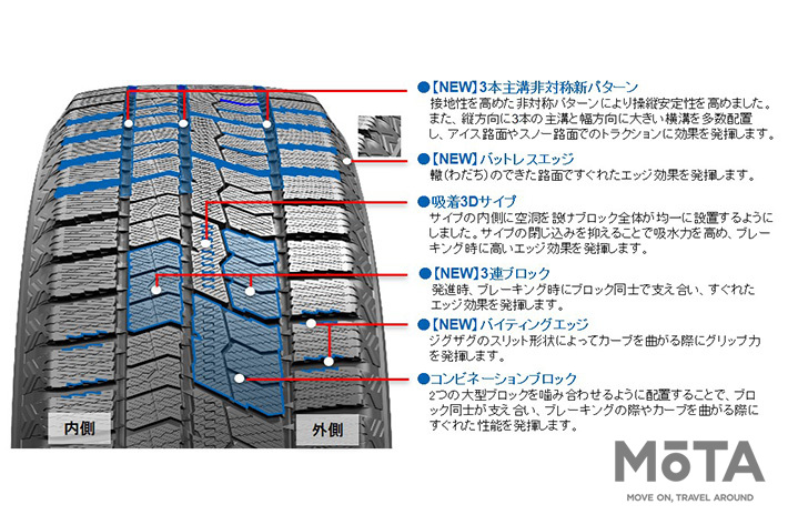 アイス性能をはじめとしたスタッドレスタイヤに求められる性能を発揮するために、トレッドパターン内で機能を分担させる非対称パターンを採用している。
