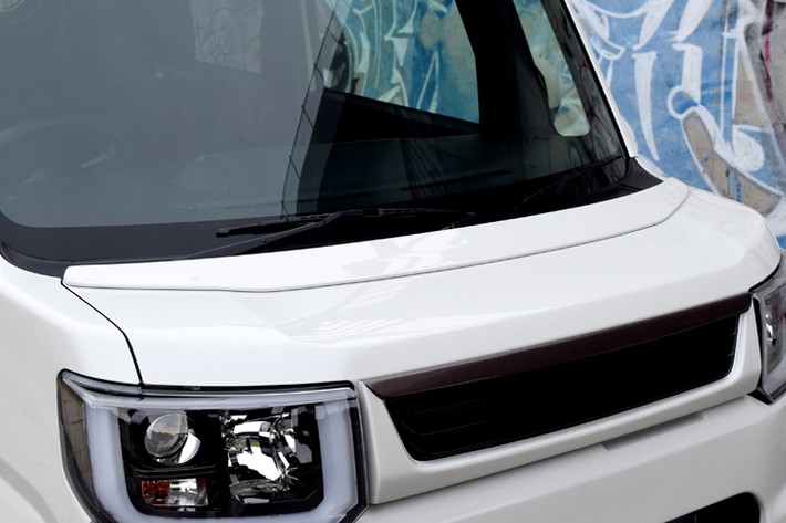 ボンネットのフロントガラス側に貼り付けて装着。大きなフロントガラスを小さく見せる効果があり、スタイリッシュな印象に。フロントガラスへの飛び石、虫よけの予防効果も期待できる。