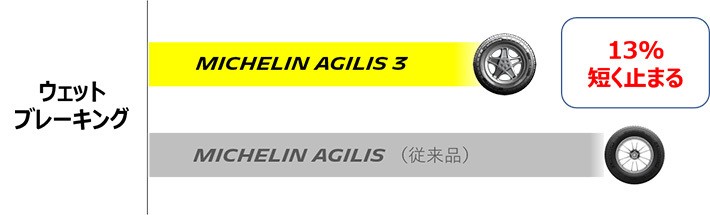 ■ウェットブレーキング性能の向上:従来品MICHELIN AGILiSとの比較で13%向上。