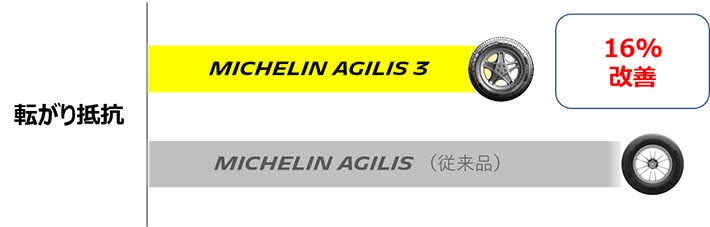 ■転がり抵抗値の改善:従来品MICHELIN AGILISとの比較で16%向上。