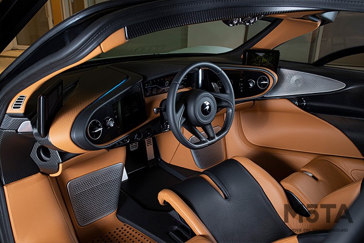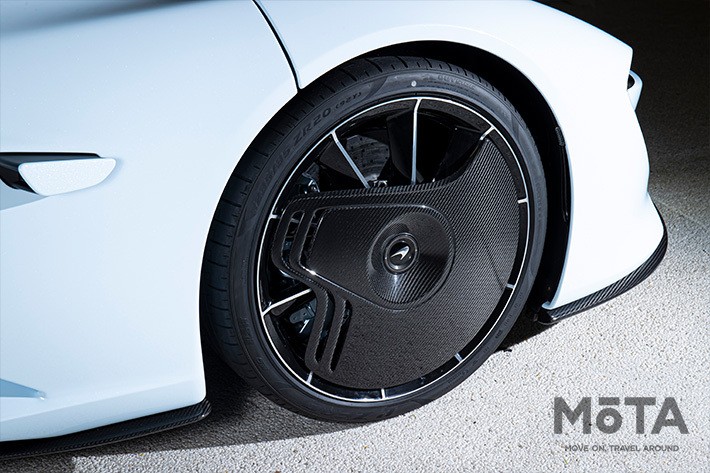 優れた運動性能を実現するために、パワートレインのみならず、ボディの軽量化も徹底。マクラーレン・スピードテールのボディは、独自のカーボンファイバー製「McLaren Monocago」構造を核とし、オールカーボンファイバー製ボディや、アルミニウム製のアクティブ・サスペンション、カーボン・セラミック製のブレーキなど、マシン全体にわたって軽量化技術が駆使されている。