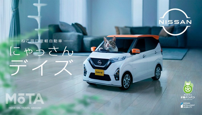 軽自動車「日産デイズ」をねこ用にアレンジした「にゃっさんデイズ」をねこが運転することで、先進技術を体験した時のワオ!を表現し、「先進技術搭載日産の軽」篇、「狭い道でも安心」篇のWEBムービーが見られる。