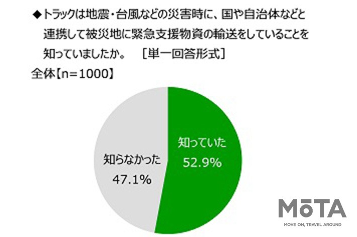 なお今回の調査結果では、「トラックが国内貨物輸送量の9割を運んでいること」に対する認知率は3割弱、「トラックは自然災害時に、国や自治体と連携して被災地に緊急支援物資の輸送をしていること」の認知率は5割強となった。