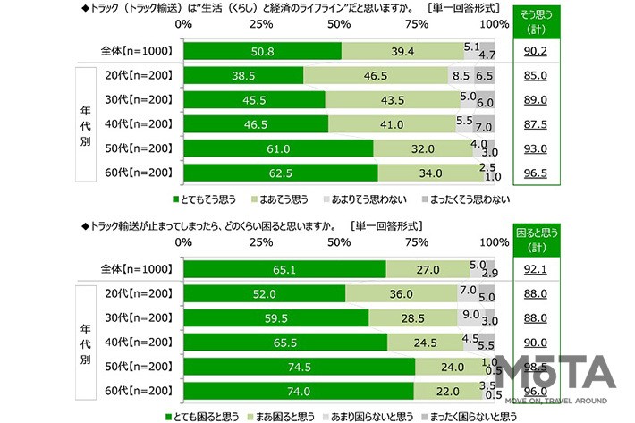 公益社団法人全日本トラック協会は、10月9日の「トラックの日」に合わせ、2020年9月11日~9月14日の4日間、全国の20歳~69歳の男女1000人を対象に「トラック輸送に関する意識調査」を実施した。