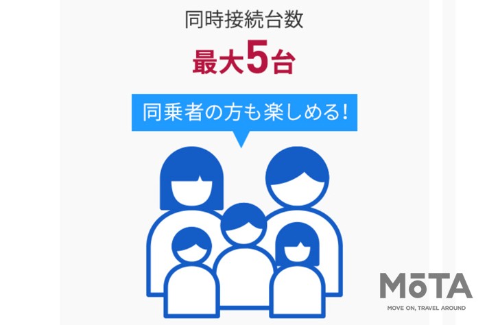 同時に最大5台までWi-Fi接続ができるため、カーナビゲーションなどの車載機器の他にも、動画・音楽などのストリーミング再生やオンラインゲームなどの多様なコンテンツを車内で快適に楽しむことができる。