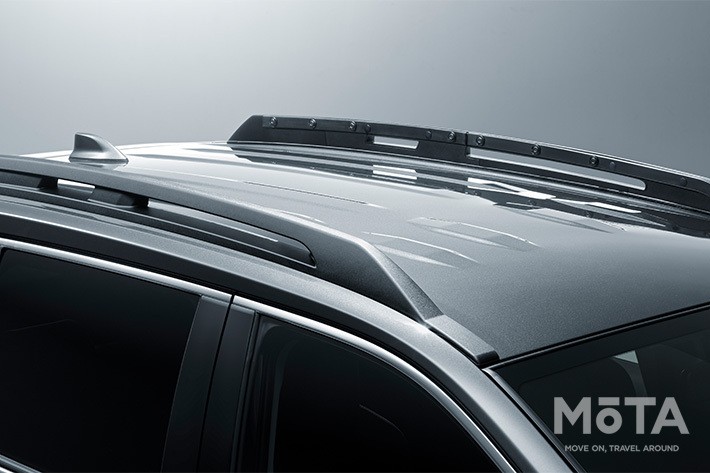 ルーフキャリアやルーフボックスを積載することができるルーフレールは、フラットタイプからブリッジタイプのルーフレールに変更。使い勝手という点ではフラットタイプと大差ないが、ブリッジにすることで生まれる“隙間”が、オフロードでのタフさを演出している。