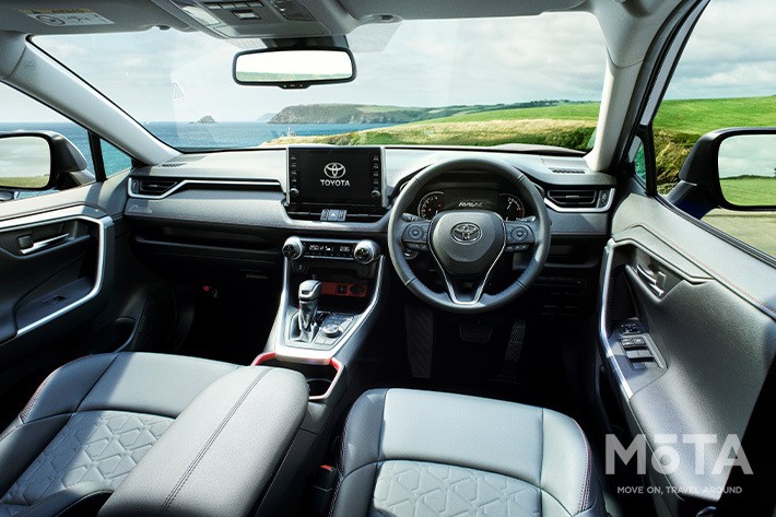 さらにインテリアでは、黒基調でいかにも武骨な雰囲気を持つインテリアに取り入れられた赤い差し色が目を引く。通常のRAV4 Adventureではオレンジの差し色なので、これも“OFFROAD package”でしか選べない特別な演出だ。