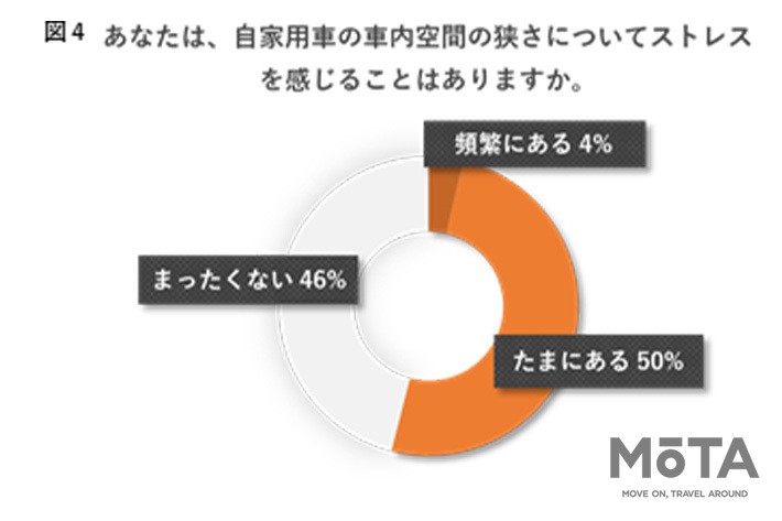 そこで車内空間に対する家族のニーズを調査したところ、ストレスを感じる要因として「におい」や「汚れ」よりも「車内空間の狭さ」を挙げる人が多く、2人に1人が車内空間の狭さにはストレスを感じていると答えた。