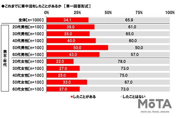 「車中泊」という言葉をよく聞くようになったが、その内容は単なる車での泊まりから本格的なキャンピングカーでの旅行まで様々ある。ホンダアクセスが、車を持っている20歳~69歳のドライバー1000人にこれまでに車中泊をしたことがあるか聞いたところ、「ある」は34.1%、「ない」は65.9%という結果となった。意外と少ないような気もするが、男女・年代別にみると50代男性が50.0%ともっとも高く、やはり車に親しんでいる世代だなと感じさせられる。