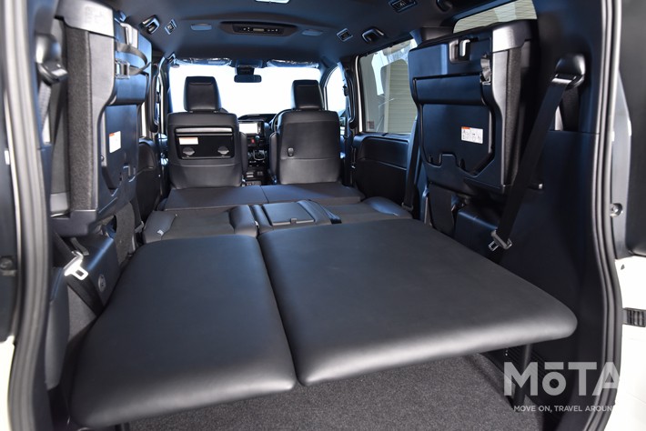 ファミリーからの支持が高いノア/ヴォクシーをベースにしたワーケーションカーは、運転席・助手席に回転シートが装備可能で、セカンドシートと対座して団らん・打ち合わせスペースとして利用できる。また、シートを倒すだけのベッド展開は、女性でも簡単にフラットな空間が作れ、後部はベッド兼ラゲッジスペースとして荷物やギアを搭載可能。トランスポーターとしても機能する。