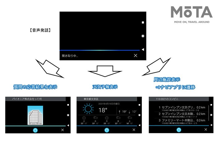 そして、Alexaからの応答結果に関連する天気や周辺施設などの情報が画像でも表示されるため、ドライバーの認識度と利便性が大幅に向上。また、周辺施設の候補一覧表示から選択するとナビアプリが自動で起動し、目的地設定やルート検索などを容易に行うことができる。