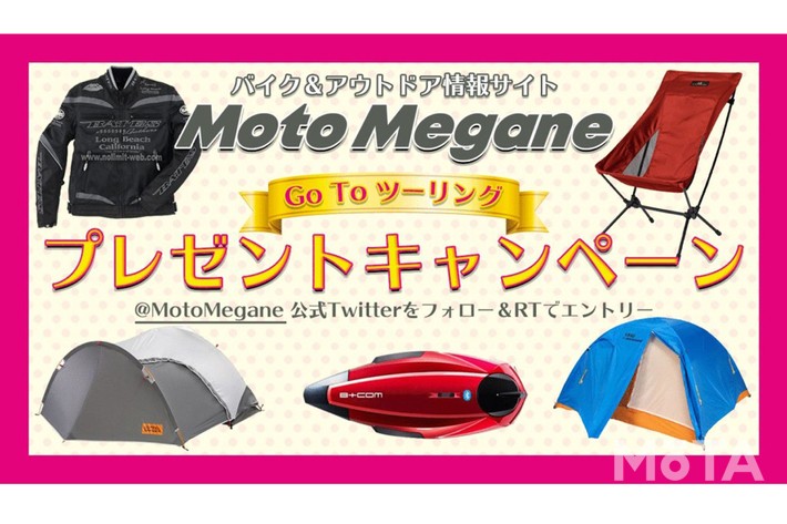 バイクやバイク関連グッズなどを紹介する情報サイト「Moto Megane(モトメガネ)」がライダー応援キャンペーン「Go To ツーリング★プレゼントキャンペーン」を2021年6月30日(水)まで開催中だ。応募した方の中から抽選でバイクツーリングテントやツーリング時に嬉しいインカム「ビーコムONE」などが当たる、バイク好きにはたまらないキャンペーンなのだ。今回は応募方法と豪華なアイテムをご紹介する。