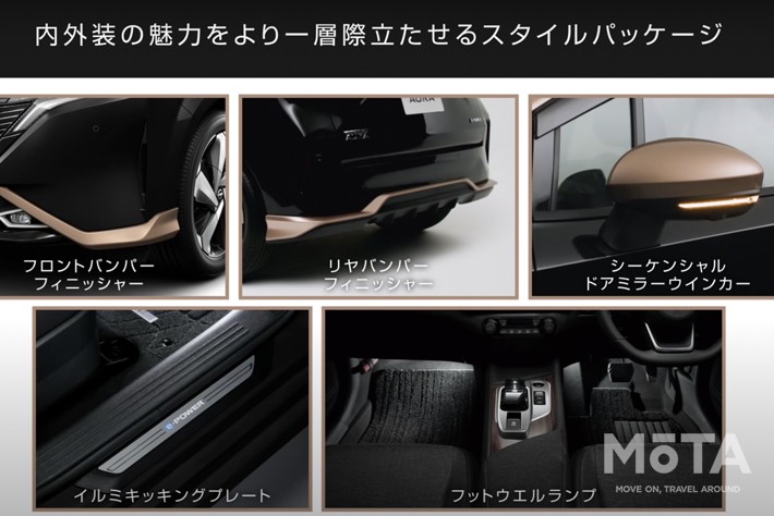 新型ノート オーラのグランドスタイルパッケージは前後バンパーに専用フィニッシャー、そしてサイドミラーには流れるウィンカーを装備。さらには内装にはドア開閉時に光るイルミネーション付きキッキングプレート、ウェルカムフットライトが備わるのだ。