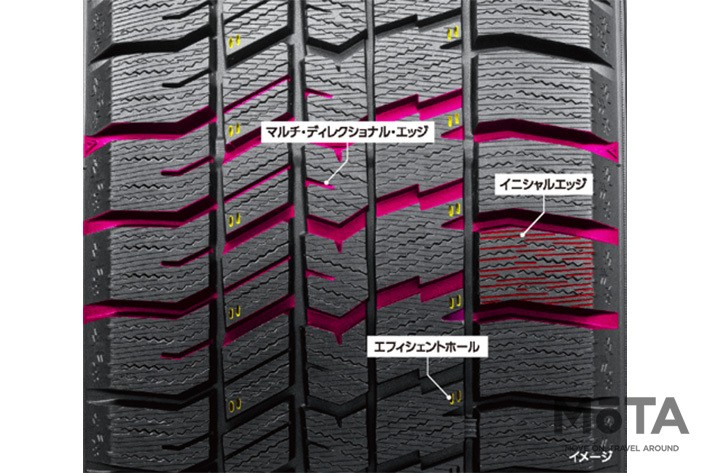 左右非対称パターンとプロファイルの最適化により、広範囲の路面へ均一な接地を実現した。これにより、アウト側の接地面積が増えたことで旋回時のグリップ向上に寄与し、氷上コーナリング性能は従来品と比較し5%アップしている。