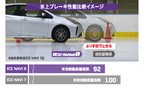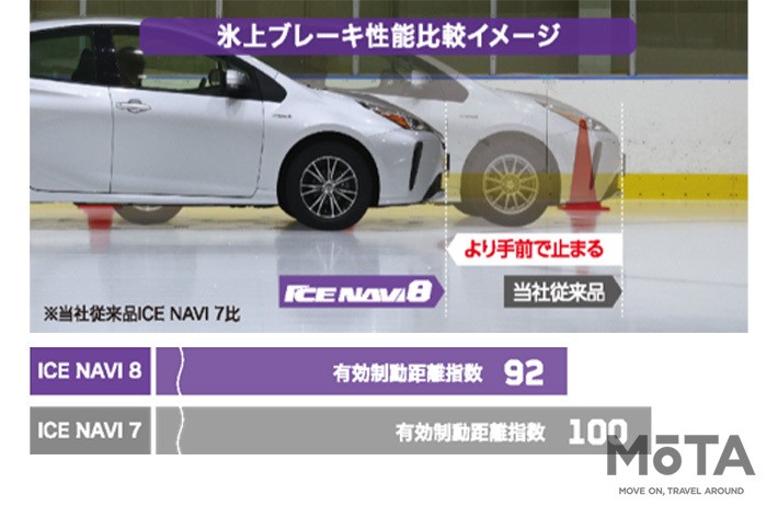 これにより、氷上でのブレーキ性能は従来品に比べ8%もアップしている。