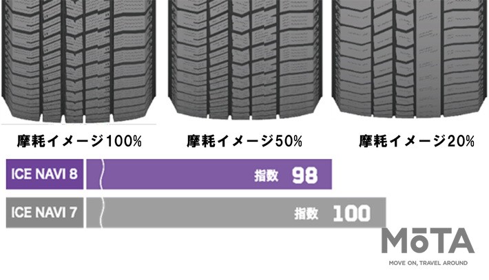 冬性能が上がると通常はライフ(長持ち)性能が下がってしまうが、ICE NAVI 8は均一摩耗プロファイルの採用により、摩耗エネルギーを分散し偏摩耗を抑制。
