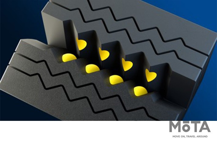 またサイプ内部に半球体状の凹凸を配置することでブロックの倒れこみを防止し、ドライ・ウェットおよび冬道走行時での高い操縦安定性を実現する。
