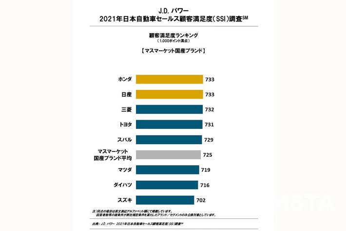 マスマーケット国産ブランドでも、前年1位だったトヨタにかわって、1位にはホンダと日産が733ポイントの同率で並び、3位に三菱(732ポイント)が選ばれた。