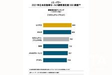 ラグジュアリーブランドでは前年の調査で1位だったアウディにかわり、1位にレクサス(809ポイント)が浮上。2位ボルボ(804ポイント)、3位BMW(772ポイント)、4位メルセデス・ベンツ(767ポイント)、5位アウディ(758ポイント)となった。