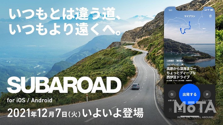 スバルは2021年12月7日(火)、スバル車ユーザーに向けてワインディングや景観が楽しめる道や名所を案内するスマートフォン用のドライブアプリ「SUBAROAD(スバロード)」をリリースした。