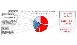 JAF徳島支部が実施したゴールデンウィーク中のロードサービス救援要請では、バッテリーとタイヤ関係のトラブルが全体の50%以上を占めます。日頃からクルマのコンディションをチェックする「日常点検」を実施することでトラブルを回避し、より安全にクルマを運転することができます。