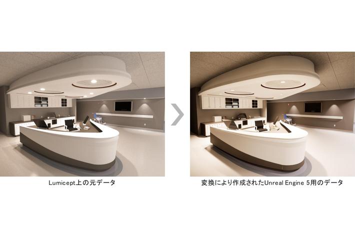 OmniPort/UEはUnreal Engine 5用のプラグインとして提供され、Lumicept用に作成されたモデルの質感や照明が、Unreal Engine 5上において元のものに近く表現されるように変換します。