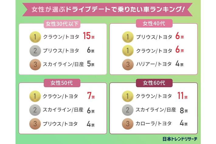 男性のランキングでは「日本を代表するスポーツカー」「特別感があって気分が上がる」などの理由で、日産の「スカイライン」が第1位になり、女性のランキングでは高級感や乗り心地が良いなどの理由で、トヨタの「クラウン」が第1位になりました。