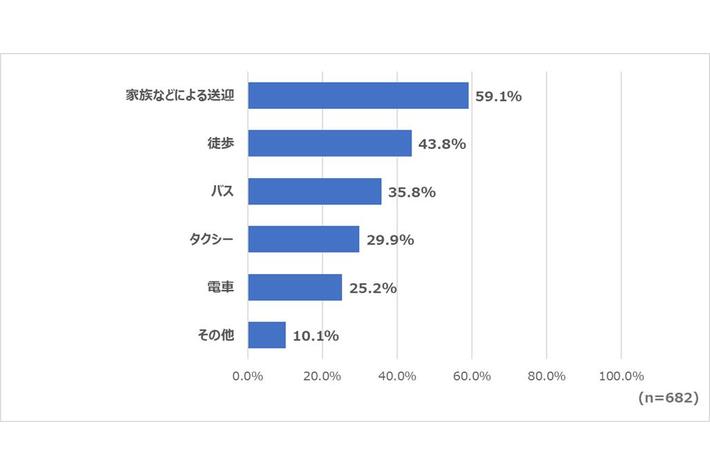 さらに、「返納された方は現在どのような移動手段を利用していますか?」と尋ねてみたところ、「家族などによる送迎」が59.1%と最も多く、「徒歩(43.8%)」「バス(35.8%)」「タクシー(29.9%)」「電車(25.2%)」が続きました。