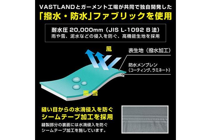 VASTLANDとガーメント工場が共同で独自開発した「撥水・防水」生地を使用しました。また、縫い目からの水滴の浸入を防ぐ、「シームテープ加工」を採用しています。